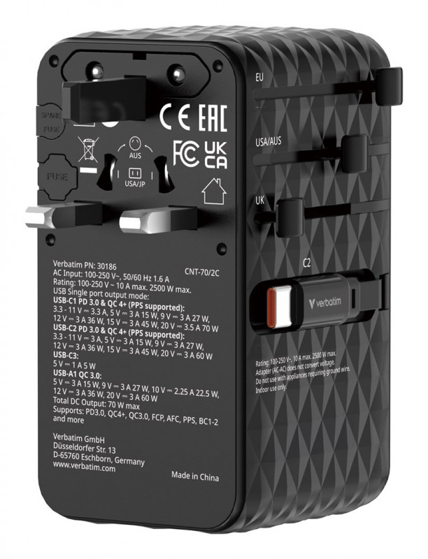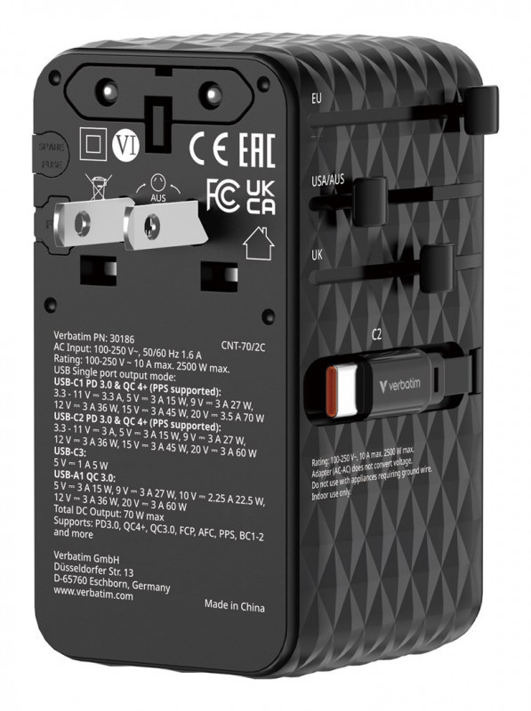 Verbatim Charge 'n' Travel 70W Universalus Juoda AC Spartusis įkrovimas Vidaus