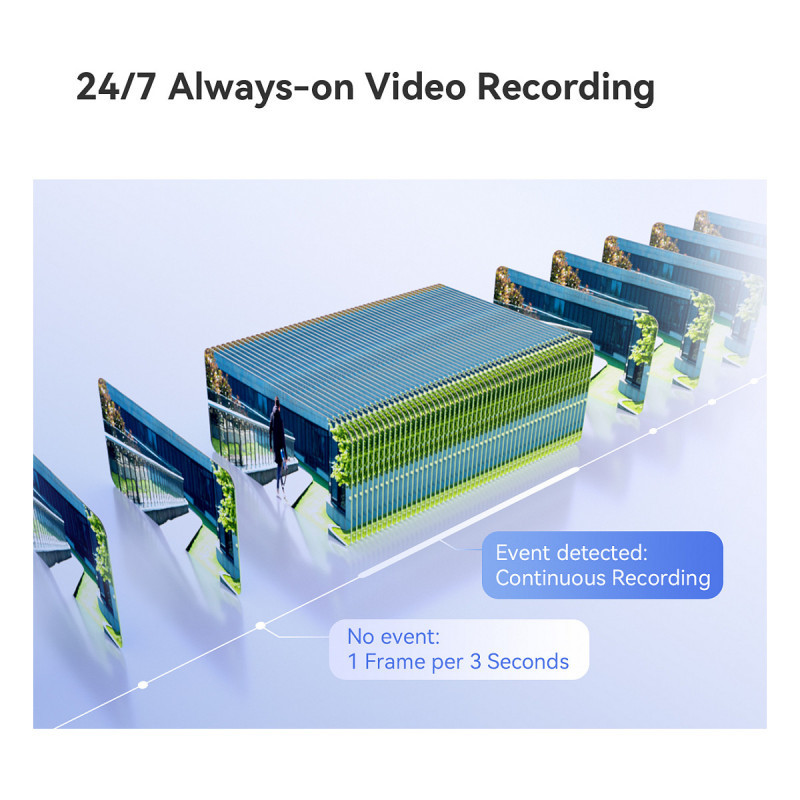 AOV Dual utilizes Imou's industry-leading Always-on Video (AOV) technology, which allows the camera to record one frame every 3 seconds to conserve memory and power when there is no event, but immediately switches to full-frame recording when an event occurs, meeting the needs of both all-day recording and power saving.