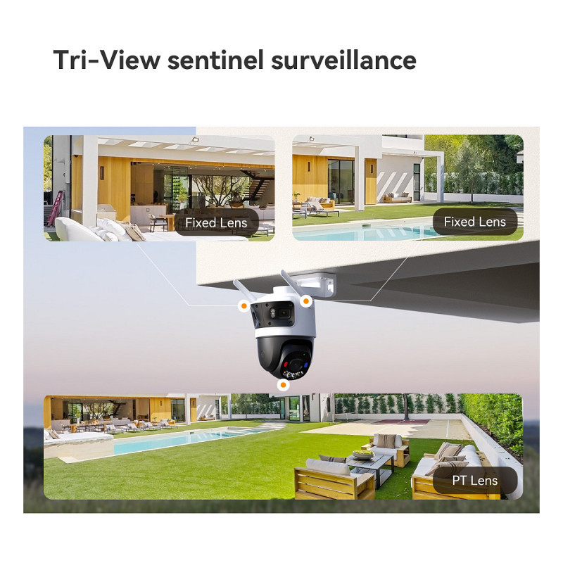 "Imou Cruiser Triple. Type: IP security camera, Placement supported: Outdoor, Connectivity technology: Wired & Wireless. Mounting type: Ceiling/wall, Product colour: Black, White, Form factor: Turret. Lens viewing angle, horizontal: 51°, Lens viewing angle, vertical: 28°, Lens viewing angle, diagonal: 60°. Sensor type: CMOS, Optical sensor size: 25.4 / 3.06 mm (1 / 3.06""). Digital zoom: 8x, Focal length range: 6 mm"\n