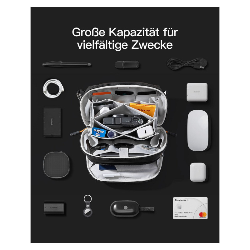 "Inateck AB03010. Product type: Storage bag, Product colour: Black, Shape: Other. Width: 250 mm, Depth: 100 mm, Height: 155 mm"\n"Efficient Storage: This origami style organizer bag has multiple interior compartments with front and back zipper pockets. The main compartment opens 180° and offers 12 different compartments/pockets for chargers, hard drives, power banks, headphones, USB cables, game/memory cards, pens, etc. There is also an AirTag pocket in the main compartment for you to store various items neatly.