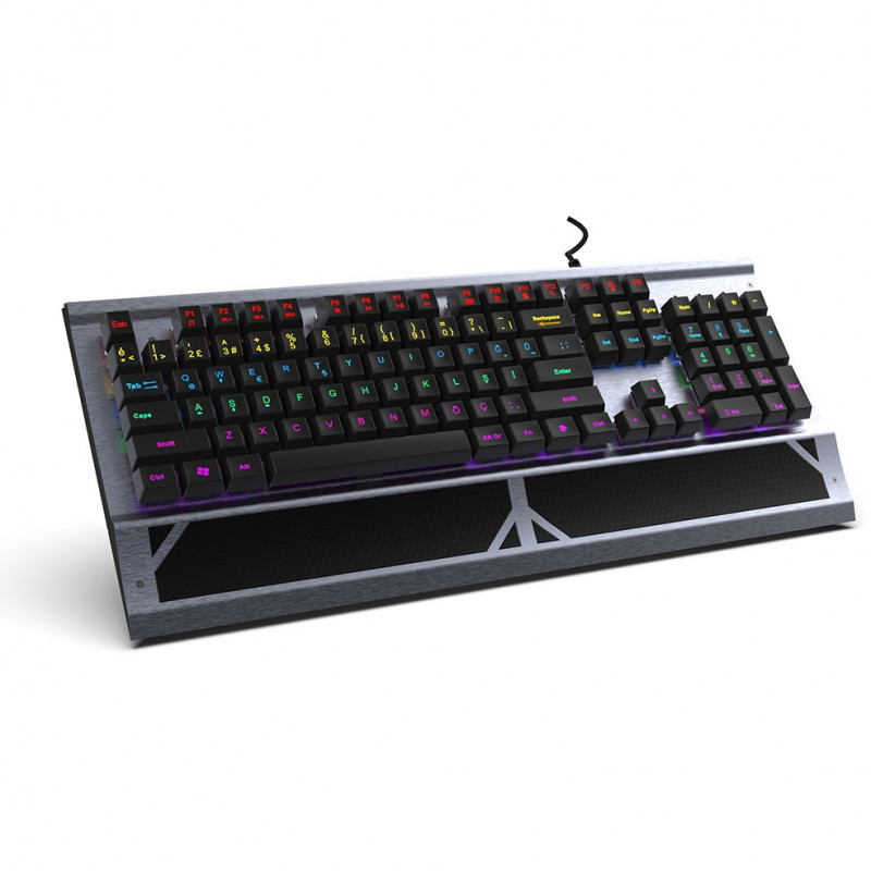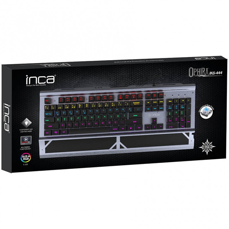 "Inca IKG-444. Keyboard form factor: Full-size (100%), Connectivity technology: Wired, Device interface: USB, Keyboard key switch: Mechanical. Backlight type: RGB LED, Wrist rest. Recommended usage: Gaming. Product colour: Grey"\n