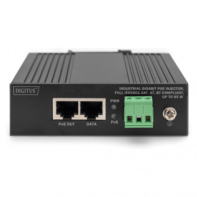 "Digitus Gigabit EthernetPoE Injector, Industrial. Networking standards: IEEE 802.3af, IEEE 802.3at, IEEE 802.3bt, Cabling technology: 10/100/1000Base-T(X), Product colour: Black. Width: 103 mm, Depth: 78 mm, Height: 32 mm. Quantity per pack: 1 pc(s). Package width: 188 mm, Package depth: 95 mm, Package height: 165 mm. Input voltage: 45 - 56 V, Output power: 85 W"\n"Industrial Gigabit PoE Injector, full IEEE802.3af, at, bt Compliant, up to 85 W