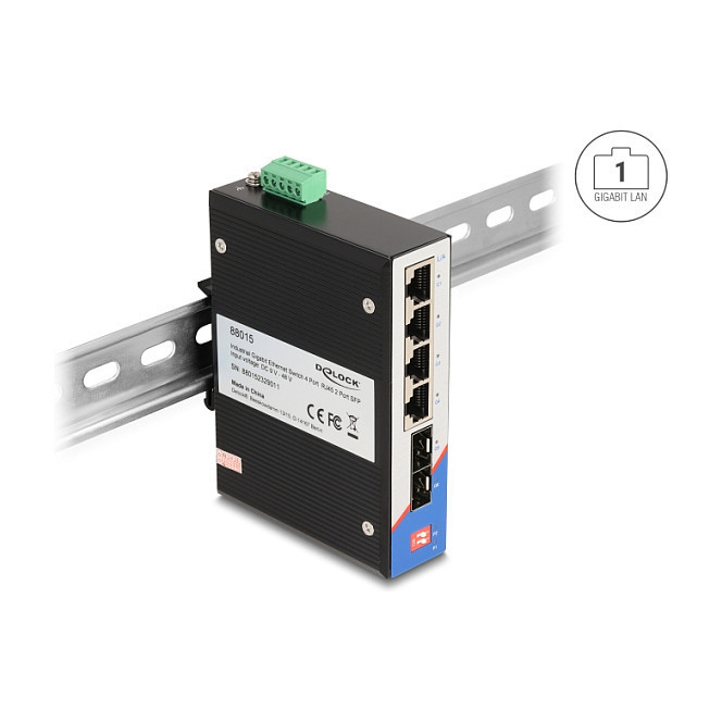 "DeLOCK Industrial Gigabit Ethernet Switch 4 Port RJ45 2 Port SFP for DIN rail. Switch type: Unmanaged. Basic switching RJ-45 Ethernet ports type: Gigabit Ethernet (10/100/1000), Basic switching RJ-45 Ethernet ports quantity: 4, Installed SFP modules quantity: 2. Switching capacity: 2 Gbit/s. Networking standards: IEEE 802.3, IEEE 802.3ab, IEEE 802.3u, IEEE 802.3z. Rack mounting"\n"This robust, industry capable Gigabit Ethernet switch by Delock can be used to connect different network components.