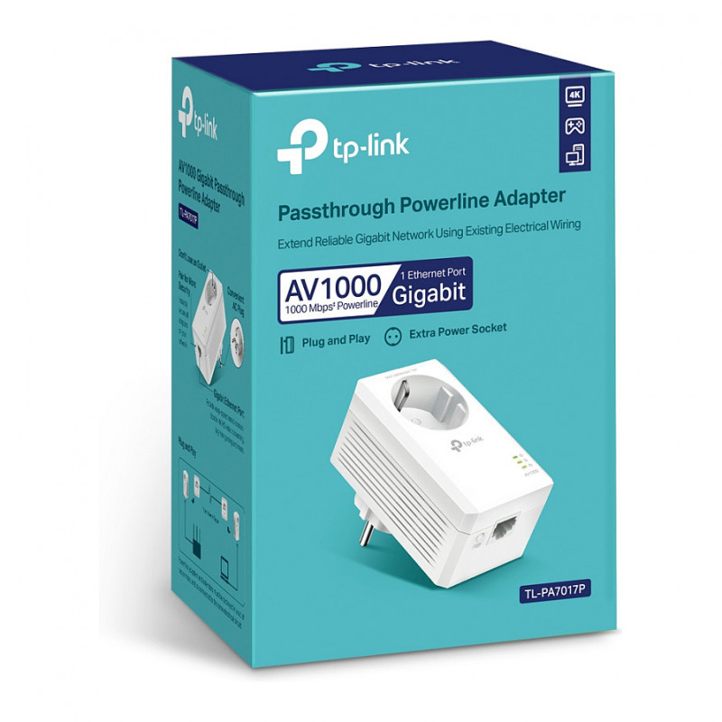 "TP-Link TL-PA7017P. Maximum data transfer rate: 1000 Mbit/s, Networking standards: IEEE 1901, IEEE 802.3, IEEE 802.3ab, IEEE 802.3u, Ethernet LAN interface type: Gigabit Ethernet. Power consumption (typical): 2.3 W, Power consumption (standby): 0.5 W, AC input voltage: 220 V. Product colour: White. Width: 95 mm, Depth: 58 mm, Height: 72 mm. Compliance certificates: RoHS"\n