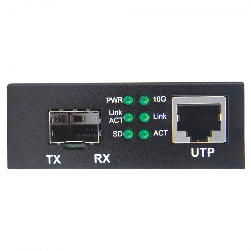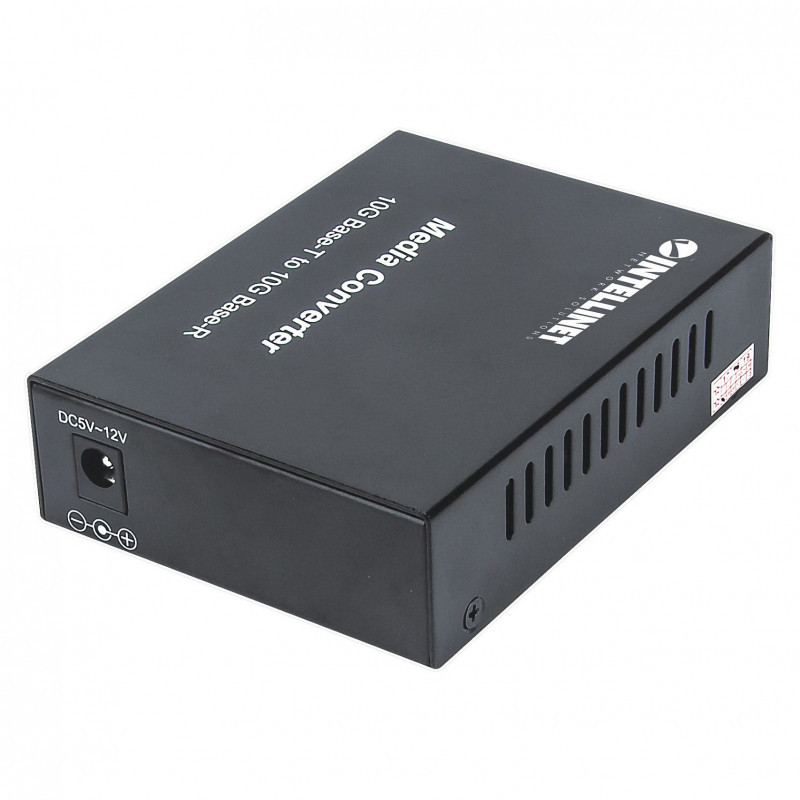 "Intellinet 10GBase-T to 10GBase-R Media Converter, 1 x 10 GB SFP+ Slot, 1 x 10GB RJ45 Port. Maximum data transfer rate: 10000 Mbit/s, Networking standards: IEEE 802.3u, Ethernet interface type: 10 Gigabit Ethernet. Maximum transfer distance: 100 m. LED indicators: Activity, Link, Product colour: Black, Housing material: Metal. Fiber optic connector: SFP+, Connectivity technology: Wired. Input voltage: 12 V, Input current: 0.5 A, Power consumption (max): 5 W"\n"The Intellinet Network Solutions 10GBase-T to 10GBase-R Media Converter offers the network designer a device for migration from copper-based Ethernet to Fibre Ethernet. Now, migration or expansion of existing networks can be achieved with minimum cost and complexity. The converter is completely transparent to the network, so the network performs exactly the way it did before, only now it can support both copper and Fibre media. And with a super-fast 10 Gbps connection, network speed stays constant for high-bandwidth data transfers._x000D_