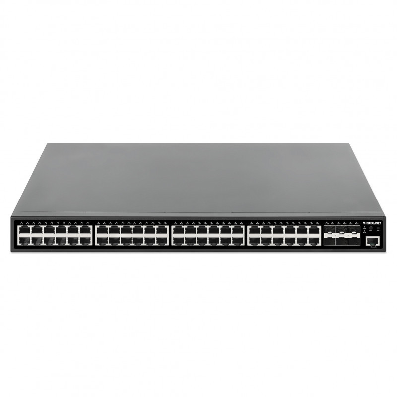 "Intellinet 48-Port Gigabit Ethernet PoE+ Layer 2+ Managed Switch with Six 10G SFP+ Uplinks IEEE 802.3at/af (PoE+/PoE) Compliant, 450 W PoE Power Budget, Layer 2+/Layer 3 Lite, 6 x 10G SFP+ Open. Switch type: Managed, Switch layer: L2+"\n"54-port 450 W Gigabit Ethernet PoE+ Layer 2+ Managed Switch with Six 10G Uplinks - a powerhouse of Power over Ethernet, ports and Self-Healing Network features