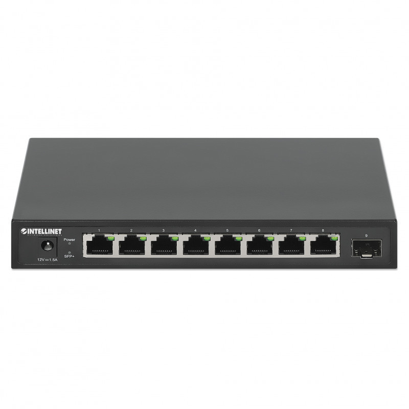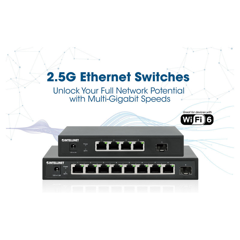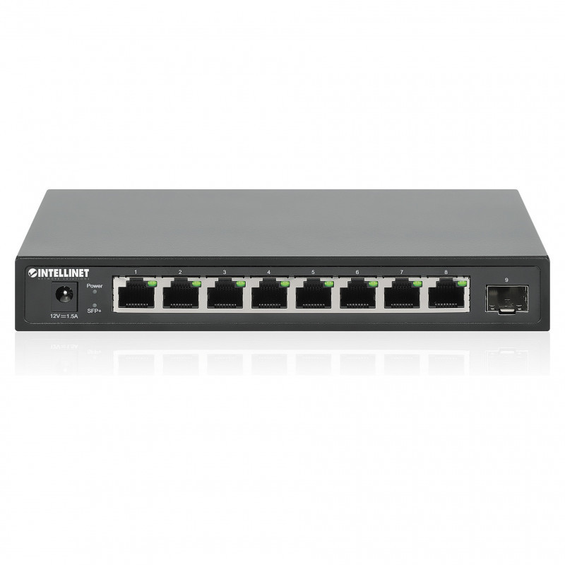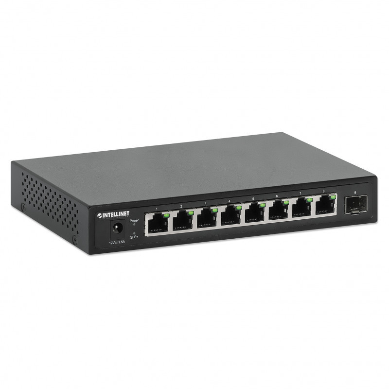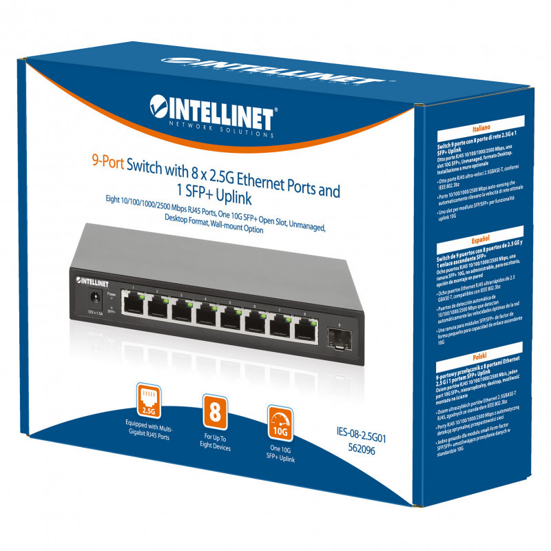 "Intellinet 9 Port Switch 8 x 2.5G Ethernet-Ports and 1 SFP+ Uplink. Switch type: Unmanaged. Basic switching RJ-45 Ethernet ports type: 2.5G Ethernet (100/1000/2500), Basic switching RJ-45 Ethernet ports quantity: 8. Full duplex. MAC address table: 4000 entries, Switching capacity: 60 Gbit/s. Networking standards: IEEE 802.3, IEEE 802.3ab, IEEE 802.3ae, IEEE 802.3bz, IEEE 802.3u, IEEE 802.3x. DC input voltage: 12 V. Power connector: DC-in jack. Wall mountable"\n"Next-gen 2.5 Gbps Desktop 8+1 Port Network Switch - Supports 10/100/1000/2500 Mbps and 10G Uplink