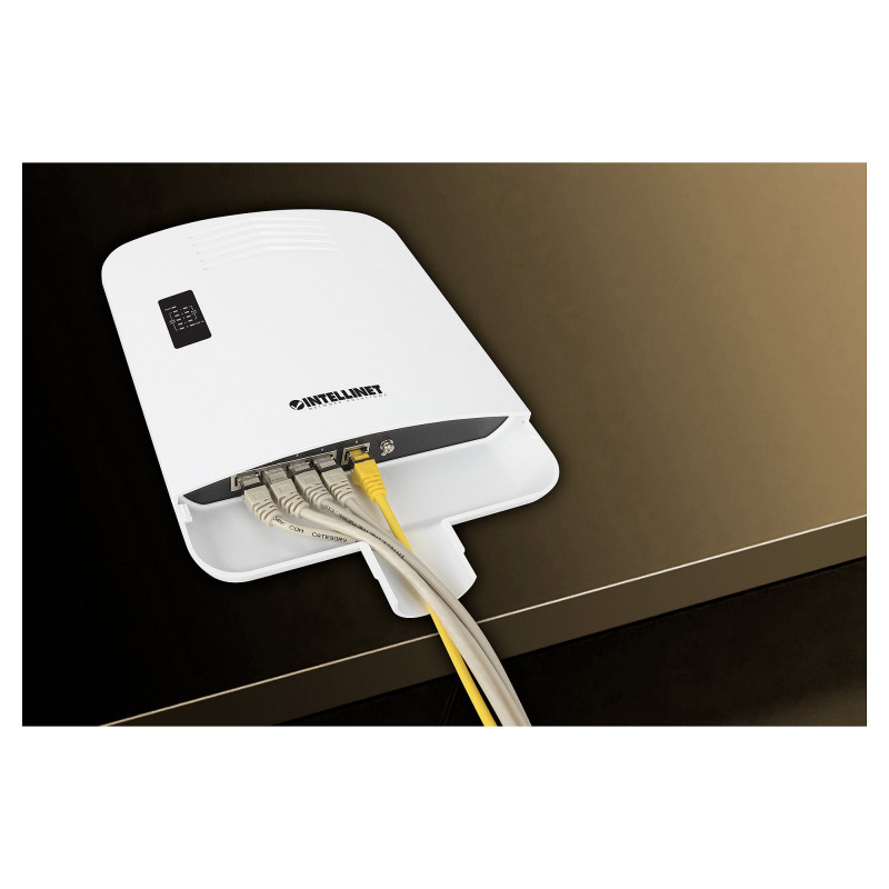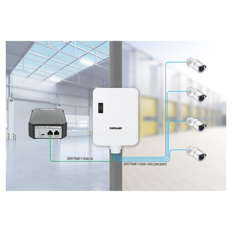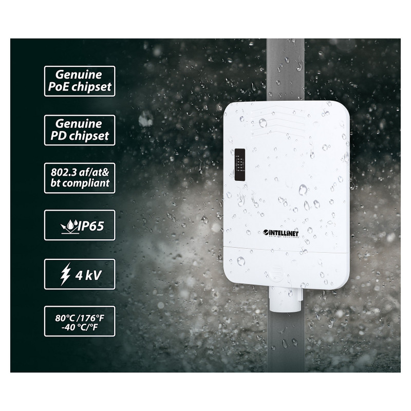 "Intellinet Outdoor PoE-Powered 5-Port Gigabit Switch with PoE Passthrough / 4-Port PoE+ Extender. Basic switching RJ-45 Ethernet ports type: Gigabit Ethernet (10/100/1000), Basic switching RJ-45 Ethernet ports quantity: 5. MAC address table: 2000 entries, Switching capacity: 10 Gbit/s. Networking standards: IEEE 802.3, IEEE 802.3ab, IEEE 802.3af, IEEE 802.3at, IEEE 802.3bt, IEEE 802.3u, IEEE 802.3x. Power over Ethernet (PoE)"\n"Waterproof Outdoor PoE Switch with extra-high range and no need for AC power thanks to PoE Passthrough - great for network cameras