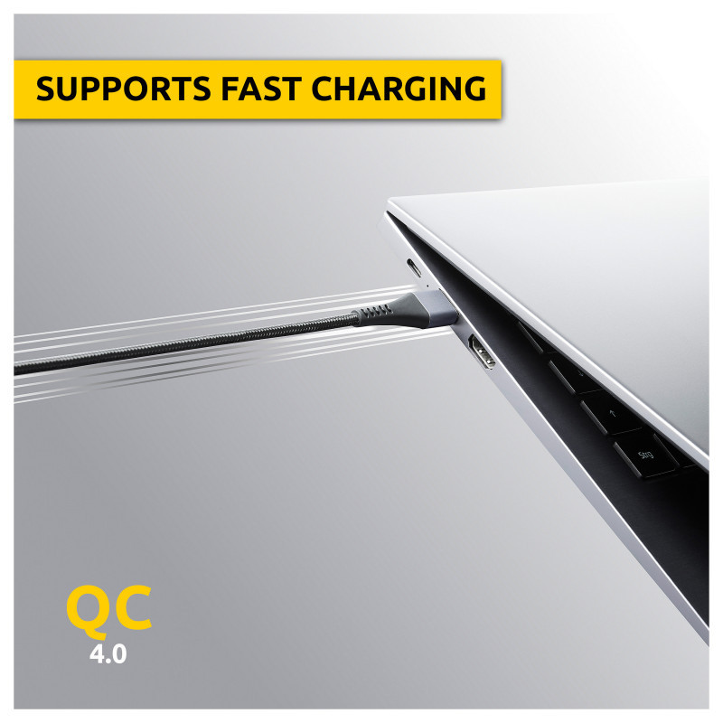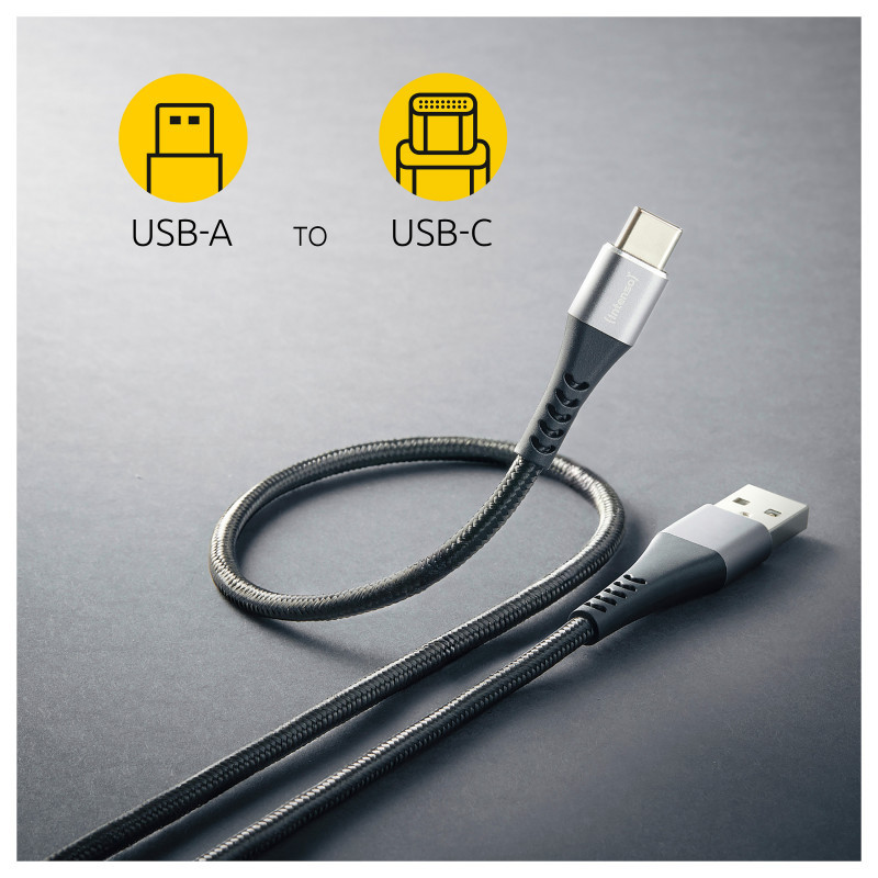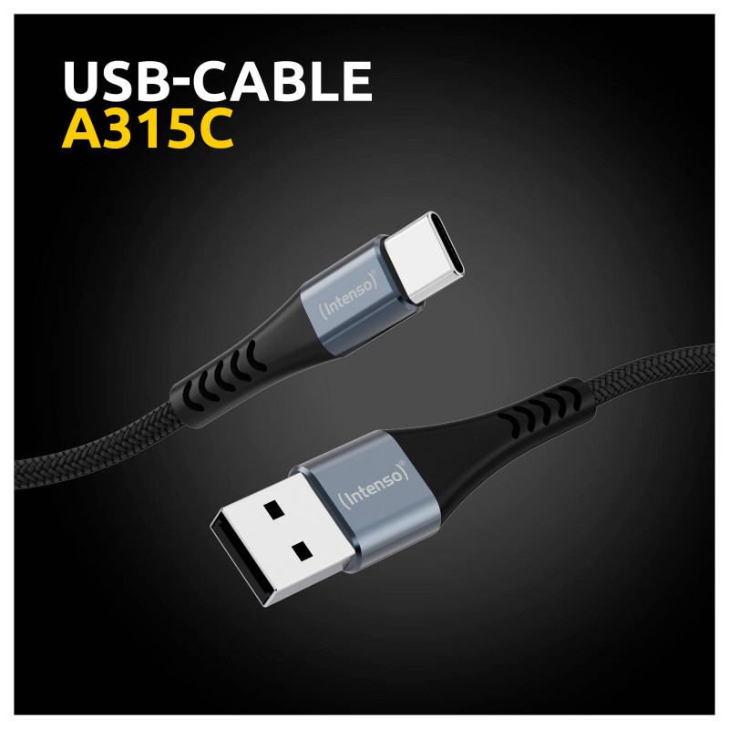 "Intenso A315C USB-C charging/data cable, 1.5m, fast charging up to 60 watts, black"\n"The Intenso A315C USB-C charging/data cable combines durability and performance in a sleek design. At 1.5 m in length, it’s perfect for versatile use at home, the office or on the go. With a USB‑A to USB‑C connection, it supports QC 3.0 fast charging up to 60 W while offering stable data transfer at 480 Mbps. Its premium nylon-aluminium jacket and reinforced strain relief areas ensure long-lasting, everyday reliability.