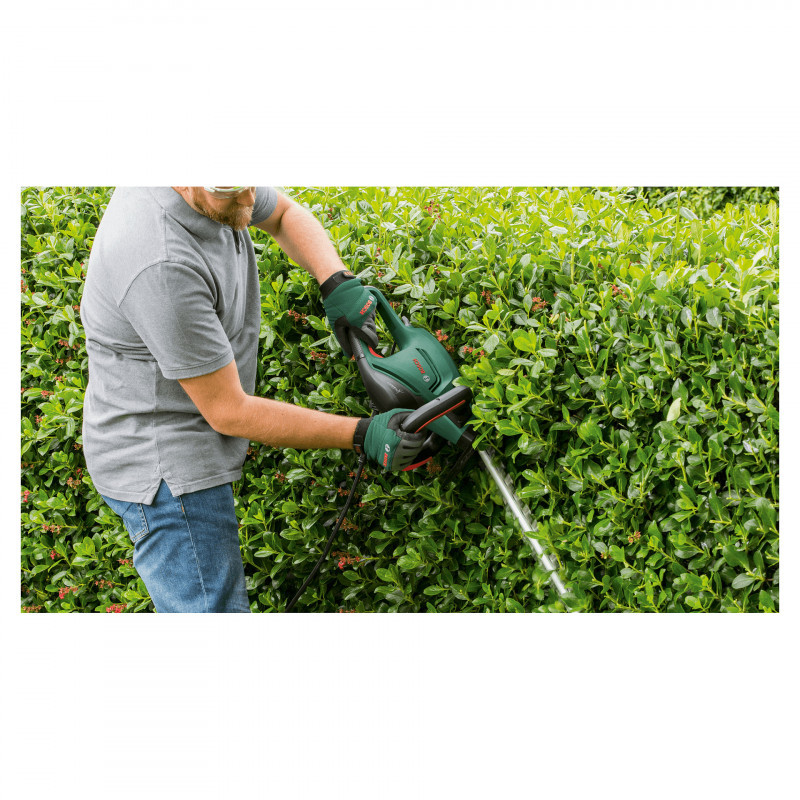Bosch UniversalHedgeCut 50 Elektro-Heckenschere – tai galinga ir patogi elektrinė gyvatvorių žirklė, skirta vidutinio dydžio gyvatvorių ir krūmų priežiūrai. Su 480 W varikliu ir 50 cm ilgio peiliu, ši žirklė užtikrina greitą ir tikslų pjovimą, net ir storesnėms šakoms iki 26 mm storio.