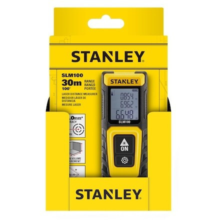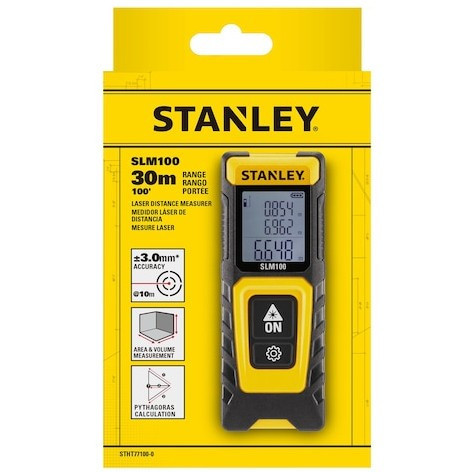 "Stanley STHT77100-0. Type: Laser distance meter, Product colour: Black, Yellow, Display type: Digital. Maximum measurement distance: 30 m, Minimum measurement distance: 0.1 m, Accuracy: 3 mm. Battery type: AAA. Width: 40 mm, Depth: 120 mm, Height: 20 mm"\n"Product Overview
