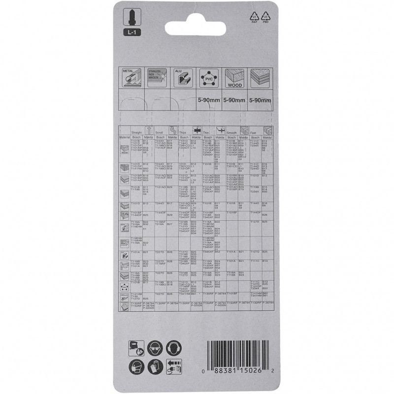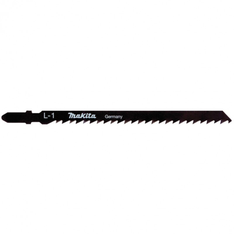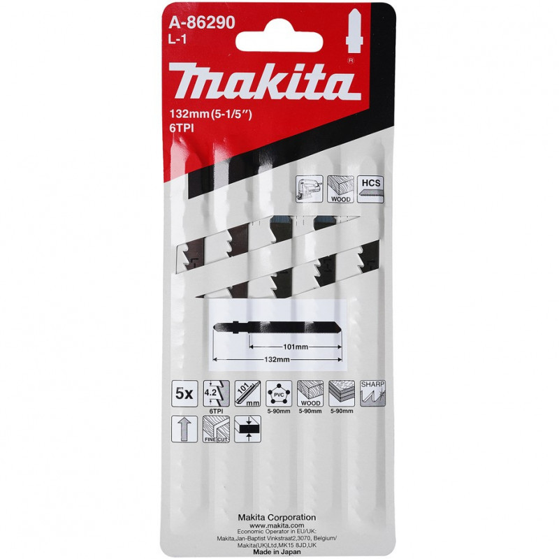 "Makita A-86290. Product type: Jigsaw blade, Suitable for materials: Plastic, Wood, Blade material: High carbon steel (HCS). Working length: 10.1 cm, Blade tooth spacing: 4.2 mm, Cutting thickness (max): 9 cm. Overall length: 13.2 cm. Quantity per pack: 5 pc(s), Package type: Blister"\n