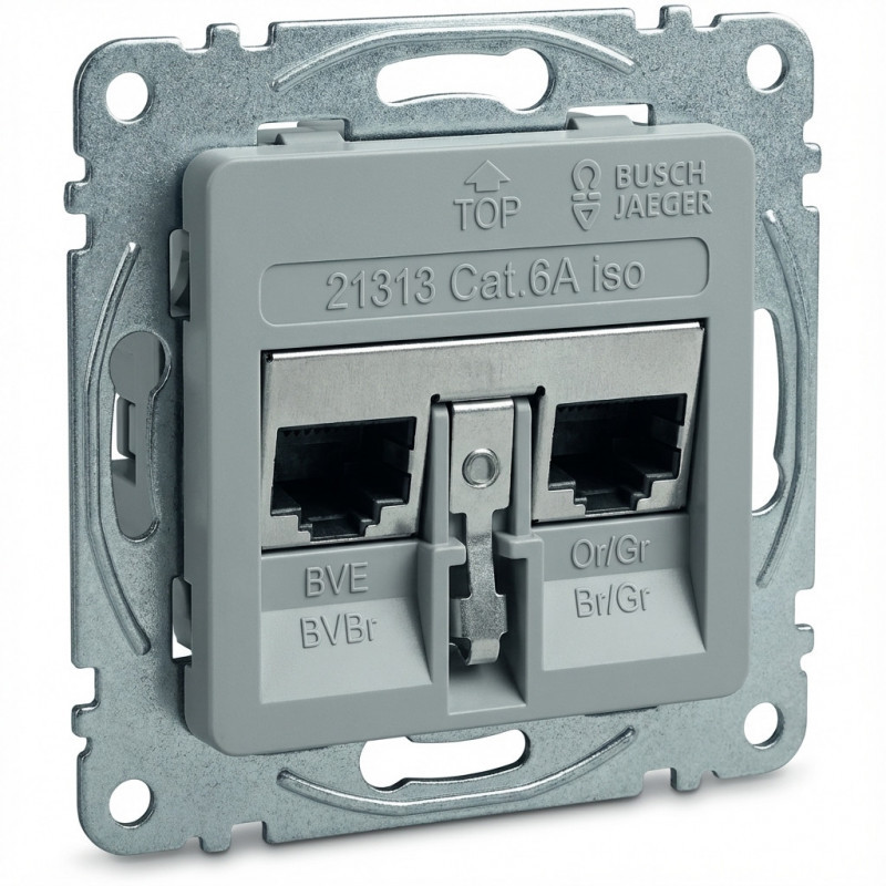 "Busch-Jaeger 0218/12-101. Socket type: 2 x RJ-45, Networking cable category: 6a. Product colour: Metallic, Certification: ISO / IEC 11801: 2011-06, EN 60 603-7-51: 2011-01, DIN EN 55022, class B. Depth: 31 mm, Input diameter: 1 cm"\n"- Mit Schrägauslass und LSA-Schneidklemmen.