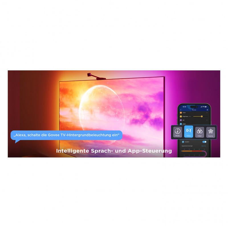 "Govee H6098. Type: Smart strip light, Interface: Wi-Fi/Bluetooth, Product colour: Black. Energy efficiency class: G, Energy consumption per 1000 hours: 2 kWh, Energy efficiency scale: A to G. Package type: Hanging box. Quantity per pack: 1 pc(s)"\n"With the Govee H6098 Envisual TV Backlight, your movie experience will become more immersive than ever before. Immerse yourself in a dynamic play of lights that automatically adjust to what is being projected on your TV, creating a unique atmosphere in your living room.