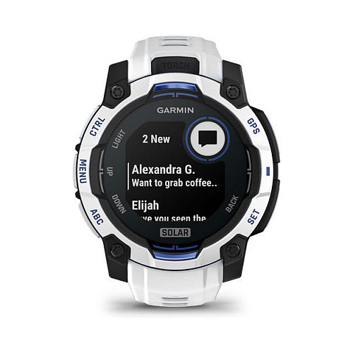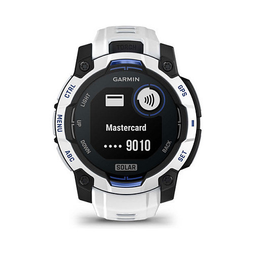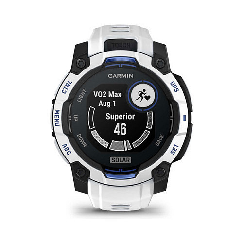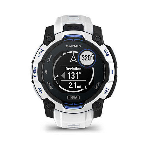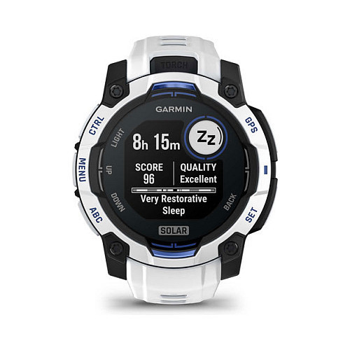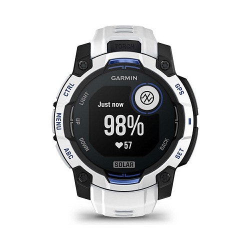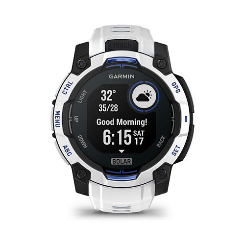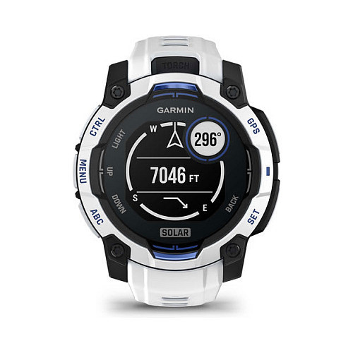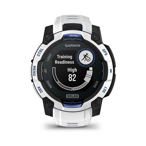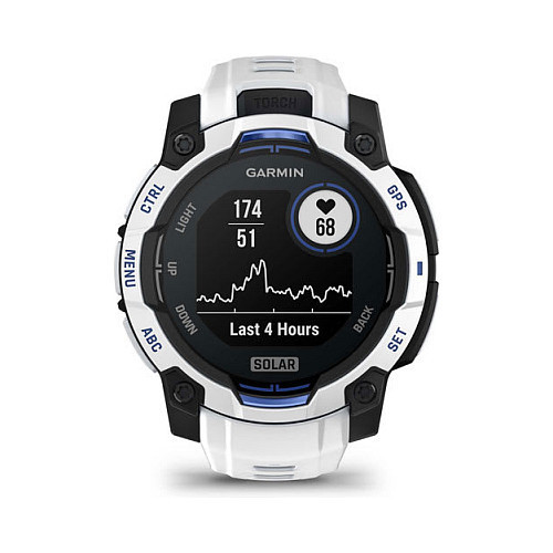 "Garmin Instinct . Display diagonal: 2.29 cm (0.9""), Display technology: MIP, Display resolution: 176 x 176 pixels, Touchscreen. Flash memory: 0.128 GB. GPS (satellite). Weight: 52 g. Band material: Silicone, Band colour: Blue, White"\n"STAY IN