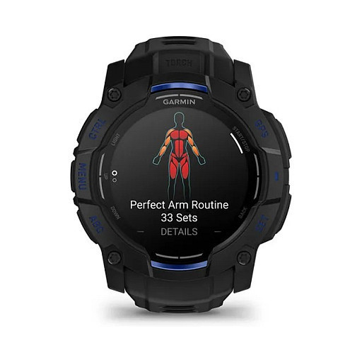 "Garmin Instinct 3. Display diagonal: 3.3 cm (1.3""), Display technology: AMOLED, Display resolution: 416 x 416 pixels. GPS (satellite). Weight: 59 g. Band material: Silicone, Band colour: Black, Blue"\n"TOUGH IT OUT
