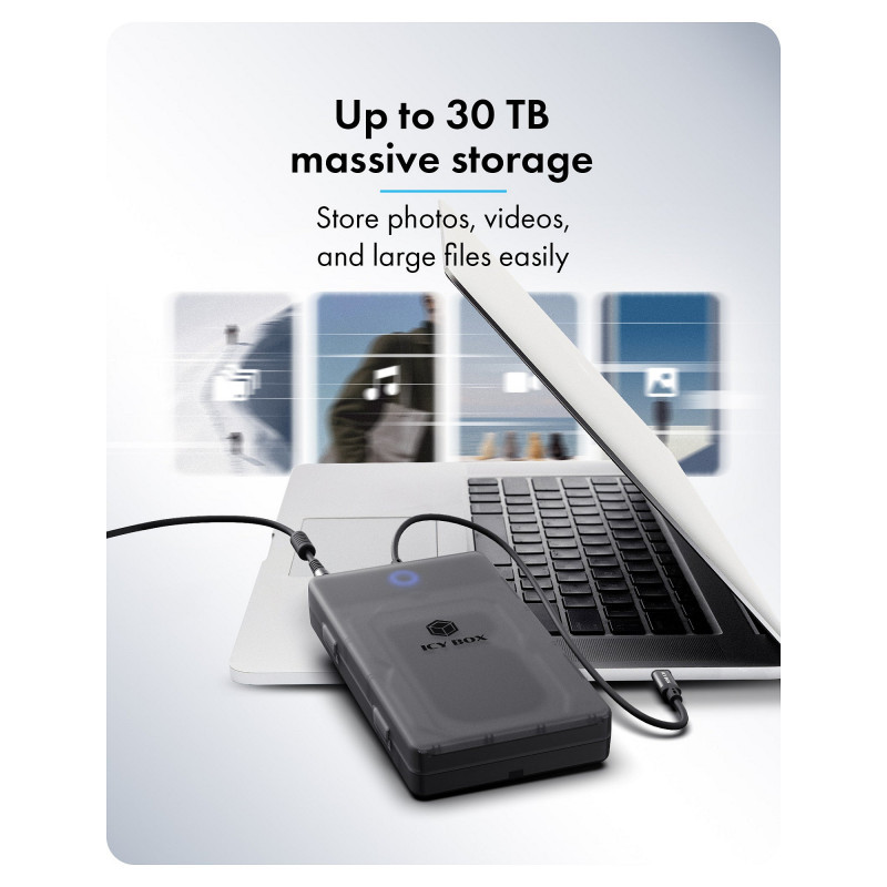 "ICY BOX Spade Base 388 Enclosure for 2.5""/3.5"" SATA SSD/HDD. Product type: HDD/SSD enclosure. Number of storage drives supported: 1, Storage drive size: 2.5/3.5"", Supported storage drive interfaces: Serial ATA, Serial ATA II, Serial ATA III, Maximum storage capacity: 30 TB. Data transfer rate: 5 Gbit/s. Hot-swap. Product colour: Black, Transparent. USB connector type: USB Type-C"\n"Ideal for data backup, management & recovery