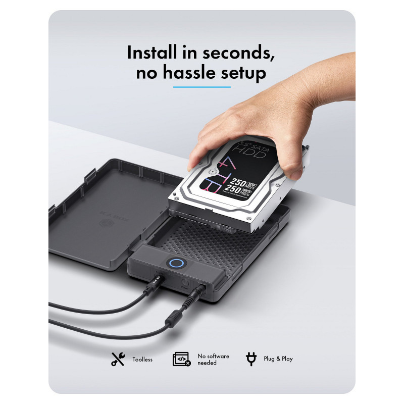 A dedicated power adapter keeps the enclosure running steadily, especially with larger 3.5″ hard drives. An LED indicator clearly shows power and drive activity: you easily see when the drive is in use. This makes monitoring transfers and backups more straightforward. All is under your control.