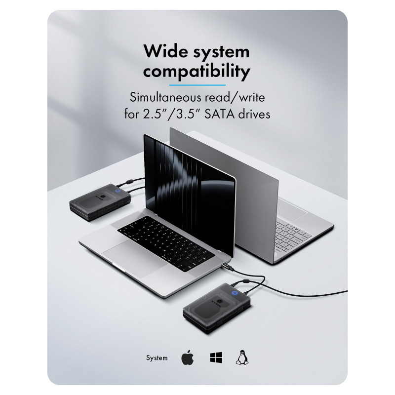 With support for 3.5″ SATA hard drives up to 30 TB, the IB-388-CU3 gives you plenty of room for backups, archives, and large file collections. It is useful for organizing data, co- pying files, or recovering content from older drives. Large storage tasks finally feel mana- geable with everything being in one place.
