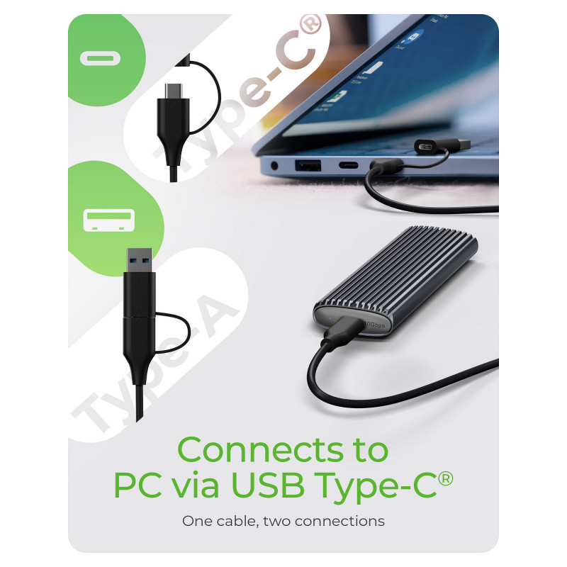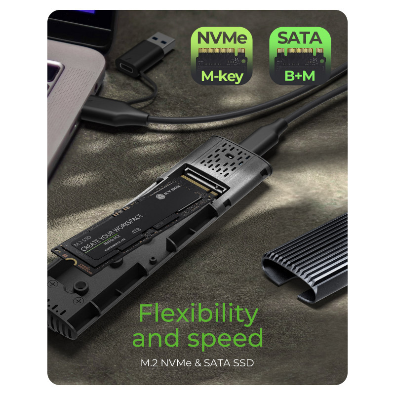 ICY BOX M.2 NVMe & SATA M.2 SSD Gehäuse, USB 3.2 (Gen 2) Type-C®/A, M-Key Sockel, Werkzeuglos, Schreibschutz