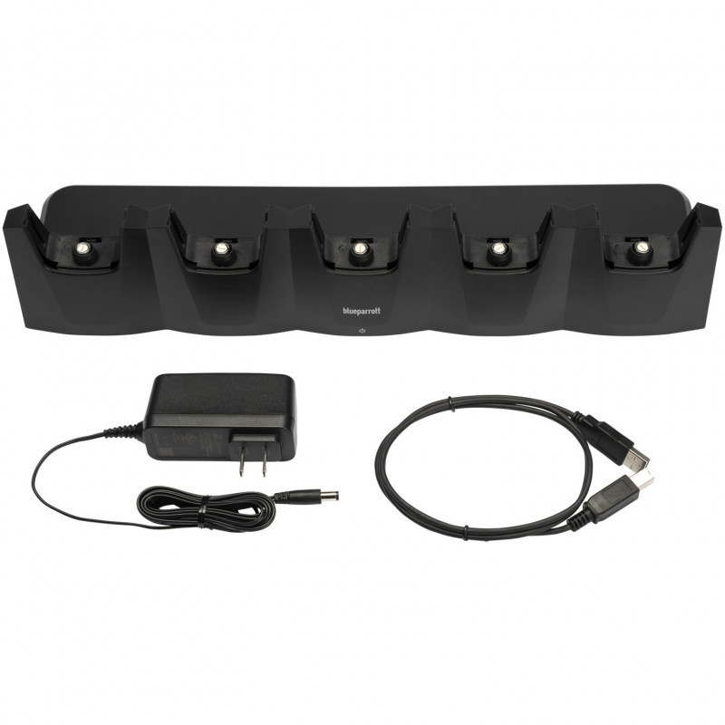 Versatile, durable charging stand that charges and updates up to five BlueParrott headsets simultaneously.