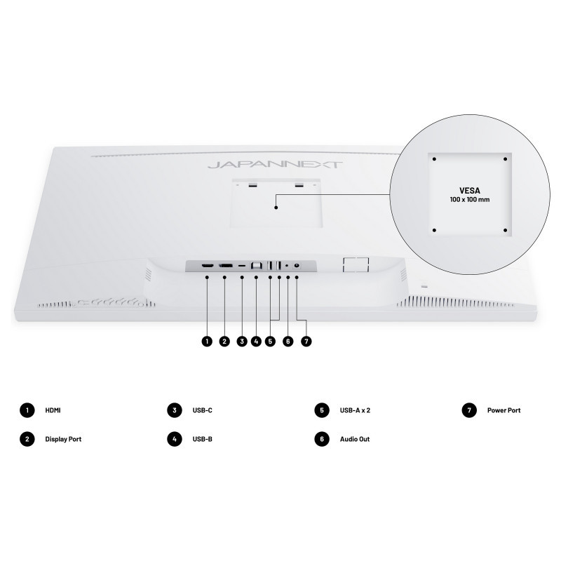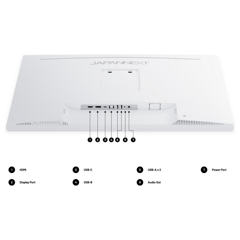 "JAPANNEXT JN-IPS270UHD60F-C65W-HSP-W. Display diagonal: 68.6 cm (27""), Display resolution: 3840 x 2160 pixels, HD type: 4K Ultra HD, Display technology: LED, Response time: 8 ms, Native aspect ratio: 16:9, Viewing angle, horizontal: 178°, Viewing angle, vertical: 178°. Built-in speaker(s). VESA mounting, Height adjustment. Product colour: White"\n"Immersive colours: