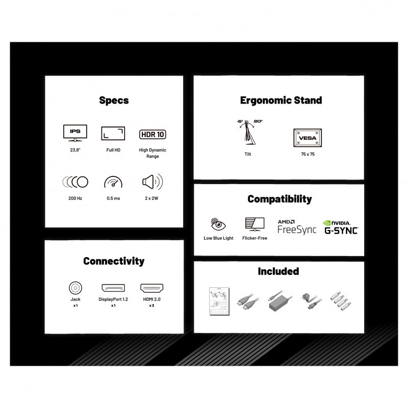 "JAPANNEXT JN-I238FHD200F. Display diagonal: 60.5 cm (23.8""), Display resolution: 1920 x 1080 pixels, HD type: Full HD, Display technology: LCD, Display surface: Matt, Response time: 0.5 ms, Native aspect ratio: 16:9, Viewing angle, horizontal: 178°, Viewing angle, vertical: 178°. Built-in speaker(s). VESA mounting. Product colour: Black"\n"The JN-I238FHD200F monitor delivers high responsiveness and flawless fluidity! With 200 Hz and an ultra-fast response time, this 23.8-inch Full HD monitor is designed for demanding competitors.