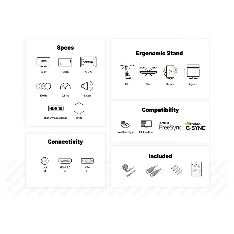 "JAPANNEXT JN-I238FHD120F-HSP-W. Display diagonal: 60.5 cm (23.8""), Display resolution: 1920 x 1080 pixels, HD type: Full HD, Display technology: LCD, Display surface: Matt, Response time: 0.5 ms, Native aspect ratio: 16:9, Viewing angle, horizontal: 178°, Viewing angle, vertical: 178°. Built-in speaker(s). VESA mounting, Height adjustment. Product colour: White"\n"Some setups require color, while others rely on the clarity of white. With its sleek design, this 23.8-inch monitor combines comfort and versatility, perfect for creatives, professionals, and gamers looking for elegance."
