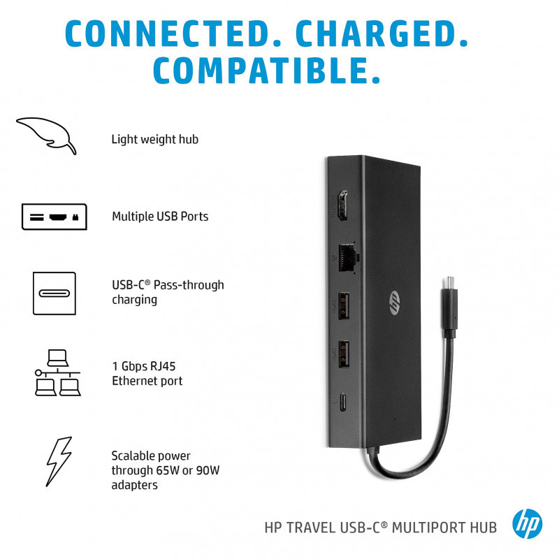 "HP Travel USB-C Multi Port Hub. Connectivity technology: Wired, Host interface: USB 3.2 Gen 1 (3.1 Gen 1) Type-C. Ethernet LAN data rates: 10,100,1000 Mbit/s. Product colour: Black, Compatible memory cards: MicroSD (TransFlash), SD, Country of origin: China. Windows operating systems supported: Windows 10, Windows 11, Other operating systems supported: ChromeOS. Width: 140 mm, Depth: 70 mm, Height: 20 mm"\n"Connected. Charged. Compatible.