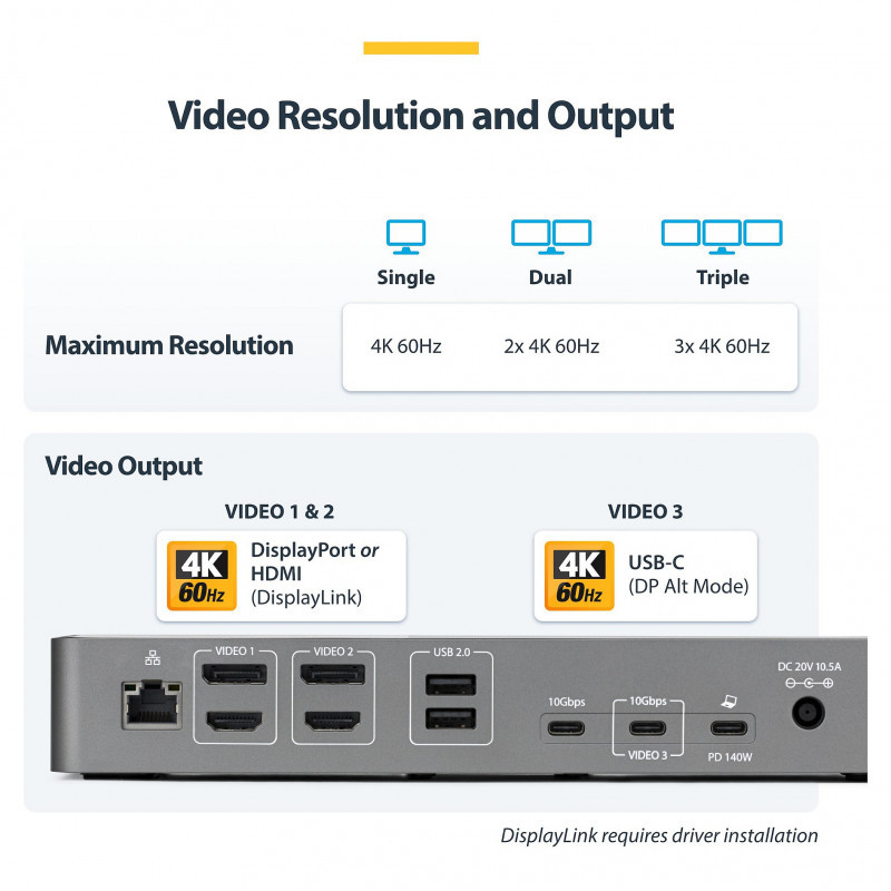 "StarTech.com Triple-Monitor USB-C Docking Station, 140W Laptop Charging Dock for MacBook Pro and Windows, 4K 60Hz HDMI or DisplayPort, TAA. Connectivity technology: Wired, Host interface: USB 3.2 Gen 1 (3.1 Gen 1) Type-C, Headphone connectivity: 3.5 mm. Ethernet LAN data rates: 10,100,1000,2500 Mbit/s. Product colour: Grey, Data transfer rate: 10 Gbit/s, HD type: 4K Ultra HD. Power source type: DC, AC input voltage: 100 - 240 V, Input current: 2.5 A. Windows operating systems supported: Windows 10, Windows 10 Education, Windows 10 Education x64, Windows 10 Enterprise, Windows 10..., Mac operating systems supported: Mac OS X 10.15 Catalina, Mac OS X 11.0 Big Sur, Mac OS X 12.0 Monterey, Mac OS X 13.0 Ventura, Mac..., Linux operating systems supported: Ubuntu 18.04 LTS, Ubuntu 20.04 LTS, Ubuntu 22.04, Ubuntu 24.04 LTS"\n"Universal triple-monitor dock compatible with macOS, Windows, and ChromeOS