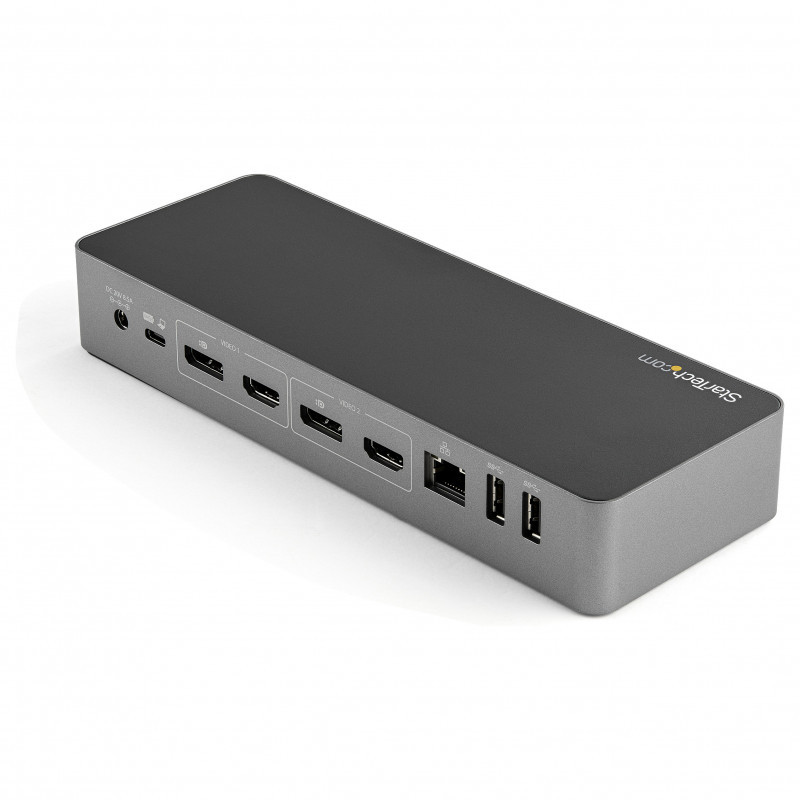 "StarTech.com Universal Laptop Docking Station, Hybrid USB-C & USB-A Dock, Dual 4K DP & HDMI, 100W PD, Mac / Windows / Chrome OS, 4x USB 5Gbps Hub, GbE. Connectivity technology: Wired, Host interface: USB 3.2 Gen 1 (3.1 Gen 1) Type-C, Headphone connectivity: 3.5 mm. Networking standards: IEEE 802.3, IEEE 802.3ab, IEEE 802.3u. Product colour: Black, Grey, Data transfer rate: 5 Gbit/s, Maximum digital resolution: 5120 x 2880 pixels. AC input voltage: 100 - 240 V, Input current: 2.5 A, Power supply: 100 W. Windows operating systems supported: Windows 10, Windows 10 Education, Windows 10 Education x64, Windows 10 Enterprise, Windows 10..., Mac operating systems supported: Mac OS X 10.11 El Capitan, Mac OS X 10.12 Sierra, Mac OS X 10.14 Mojave, Mac OS X 10.15 Catalina,..., Other operating systems supported: ChromeOS"\n"Transition from the legacy USB-A (USB 3.0) to the new USB-C with this certified universal laptop docking station for USB-C and USB-A laptops. The USB-C dock features 100W Power Delivery 3.0, dual HDMI and/or DisplayPort monitors, fast-charge, and both USB-C and USB-A peripheral ports.