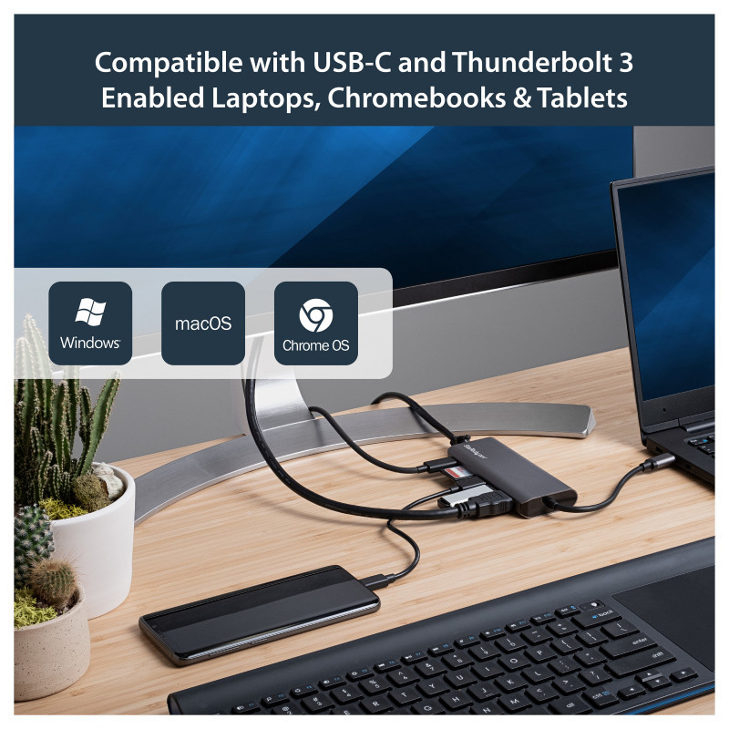 "StarTech.com USB C Multiport Adapter - USB-C Travel Dock to 4K HDMI, 3x USB 3.0 Hub, SD/SDHC, GbE, 60W PD 3.0 Pass-Through - USB Type-C/Thunderbolt 3 - Replaces DKT30CSDHPD. Connectivity technology: Wired, Host interface: USB 3.2 Gen 1 (3.1 Gen 1) Type-C. Ethernet LAN data rates: 10,100,1000 Mbit/s, Networking standards: IEEE 802.3, IEEE 802.3ab, IEEE 802.3u. Product colour: Black, Grey, Compatible memory cards: MicroSD (TransFlash), MicroSDHC, MicroSDXC, SDHC, SDXC, Data transfer rate: 5 Gbit/s. Power source type: USB. Windows operating systems supported: Windows 10, Windows 10 Education, Windows 10 Education x64, Windows 10 Enterprise, Windows 10..., Mac operating systems supported: Mac OS X 10.11 El Capitan, Mac OS X 10.12 Sierra, Mac OS X 10.13 High Sierra, Mac OS X 10.14..., Other operating systems supported: ChromeOS"\n"Portable Docking Station | Mac & Windows® | 4K | GbE | Thunderbolt™ 3 Compatible