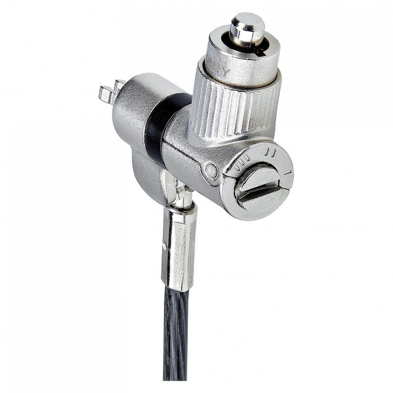 A unique on-the-fly lock tip mechanism enables quickly adapting the lock tip to fit different security slot types. Simply rotate the lock selection dial to change the shape of the lock tip to match the security slot, without requiring additional tools or carry separate lock tips. The cut-resistant steel security cable is 6.6ft (2m) long providing reach and durability.