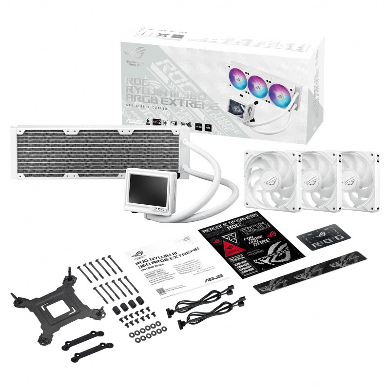 "ASUS ROG RYUJIN III 360 ARGB EXTREME WHT. Type: All-in-one liquid cooler, Fan diameter: 12 cm. Product colour: White"\n"Experience exceptional performance with the ROG Ryujin III 360 ARGB Extreme White Edition, featuring Asetek’s Emma Gen8 V2 pump and enhanced magnetic ROG ARGB fans to maximize the power of AMD AM5 9000 Series and Intel® Core™ Ultra Processors. This advanced cooling solution includes an embedded VRM fan for stable performance during intense tasks. With an upgraded LCD offering 480p resolution and 60Hz refresh rate, enjoy a smoother visual experience—unlock limitless possibilities with the ROG Ryujin III 360 ARGB Extreme White Edition!
