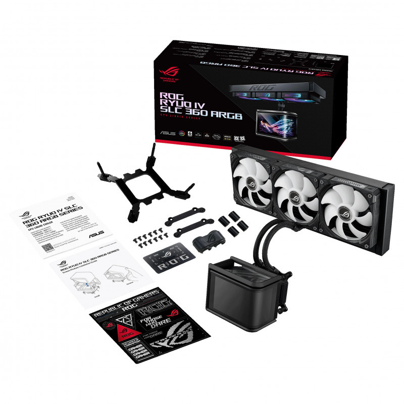 "ASUS ROG Ryuo IV SLC 360 ARGB. Type: All-in-one liquid cooler, Fan diameter: 12 cm. Product colour: Black"\n"ROG Ryuo IV SLC 360 ARGB