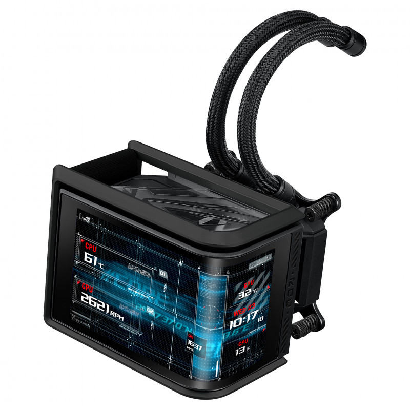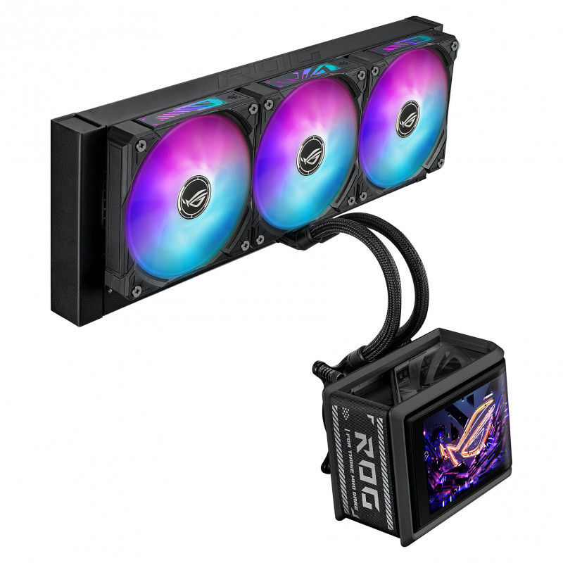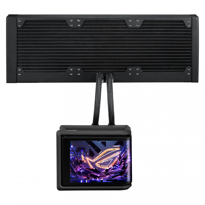 ROG Ryuo IV SLC 360 ARGB features a 6.67-inch AMOLED display, enabling intuitive control through dedicated software to smoothly display 3D videos, customized content, or hardware information. The innovative curved-screen design breaks the boundaries between the virtual and the real. The shorter 200mm tubing and a sliding LCD panel also reduce component obstruction, maximizing the visual experience. The powerful pump and ROG ARGB fans provide stable cooling performance for CPUs, including the AMD Ryzen™ 9000 series and Intel® Core™ Ultra processors."