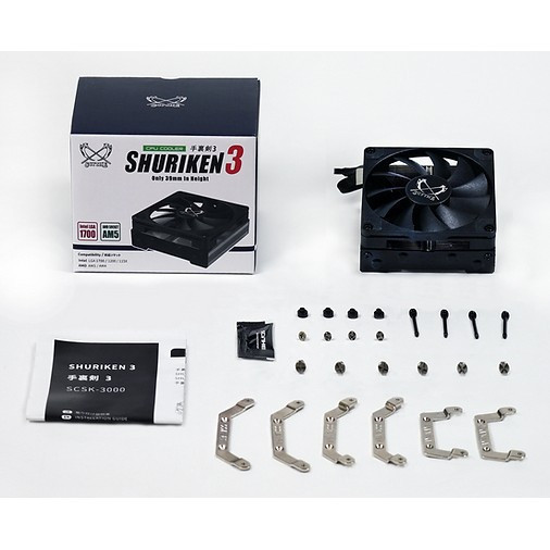 "Scythe SHURIKEN 3. Type: Fan, Fan diameter: 9.2 cm, Minimum air pressure: 0.02 mmH2O, Maximum air pressure: 1.99 mmH2O. Width: 92 mm, Depth: 94.4 mm, Height: 39 mm. Product colour: Black"\n"SHURIKEN 3