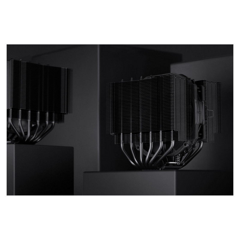 "Noctua NH-D15S chromax.black. Type: Cooler, Fan diameter: 14 cm, Rotational speed (min): 300 RPM, Rotational speed (max): 1500 RPM, Airflow: 140.2 m³/h, Bearing type: Self-Stabilising Oil-pressure Bearing (SSO). Voltage: 12 V. Width: 150 mm, Depth: 135 mm, Height: 160 mm. Product colour: Black"\n"The NH-D15S chromax.black is an all-black version of Noctua’s award-winning NH-D15S premium-quality quiet CPU cooler. Thanks to the same asymmetrical dual-tower heatsink design and single NF-A15 PWM fan, it stays true to the NH-D15S’s successful formula of fusing dual-tower performance with excellent RAM, case and PCIe compatibility. At the same time, the chromax.black version with its black fan and black coated heatsink combines these assets with a sleek stealth look. Topped off with the renowned SecuFirm2™ multi-socket mounting system, Noctua’s enthusiast-grade NT-H1 thermal compound and a full 6-year manufacturer’s warranty, the NH-D15S chromax.black is a premium choice for customers who seek a highly compatible dual-tower heatsink that looks just as great as it cools."