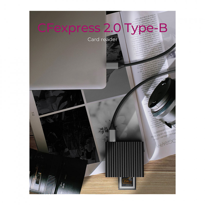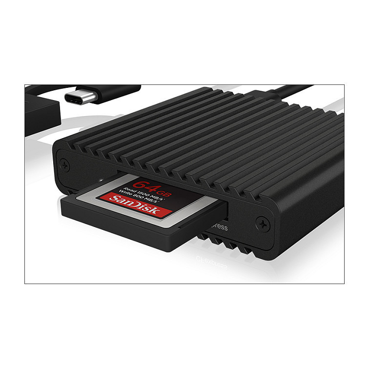 "ICY BOX IB-CR404-C31. Compatible memory cards: CFast 2.0, Product colour: Black, Data transfer rate: 10000 Mbit/s. Width: 64 mm, Depth: 59 mm, Height: 15 mm. Quantity per pack: 1 pc(s), Package width: 27 mm, Package depth: 105 mm. Compatible operating systems: Windows, macOS, ChromeOS. Products per master (outer) case: 40 pc(s)"\n"The new IB-CR404-C31 is a card reader for CFexpress 2.0 Type-B memory cards. With USB 3.2 (Gen 2) and thus up to 10 Gbit/s, it can read and write to CFexpress 2.0 memory cards with NVMe protocol at blazing speed. The USB combination cable ensures broad compatibility with USB Type-C and Type-A connections. The high-quality housing made of solid aluminium is able to optimally dissipate the heat generated by the memory card through the integrated cooling fins.