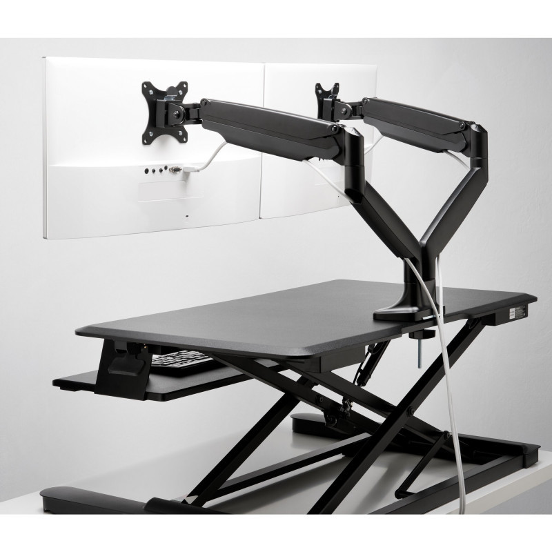 "Kensington SmartFit One-Touch Height-Adjustable Dual Monitor Arm. Mounting: Clamp, Maximum weight capacity: 9 kg, Minimum screen size: 33 cm (13""), Maximum screen size: 86.4 cm (34""), Minimum VESA mount: 75 x 75 mm, Maximum VESA mount: 100 x 100 mm. Height adjustment, Tilt angle range: -90 - 90°. Product colour: Black"\n"Professionals who spend long hours working at a desk often struggle with poor posture, eye strain, as well as neck, back and shoulder discomfort. The SmartFit™ One-Touch Height Adjustable Dual Monitor Arm supports more comfortable monitor placement. Thoughtfully designed to simplify proper ergonomic fit, it offers a fully articulating design for maximum flexibility. A heavy-duty build provides stability in every position while its gas spring monitor mount makes adjusting the height, depth and angle of your monitors effortless — from landscape to portrait mode. The built-in cable management system organises and conceals cables while the arm lifts your external monitor up and out of the way, decluttering and clearing valuable desk space."