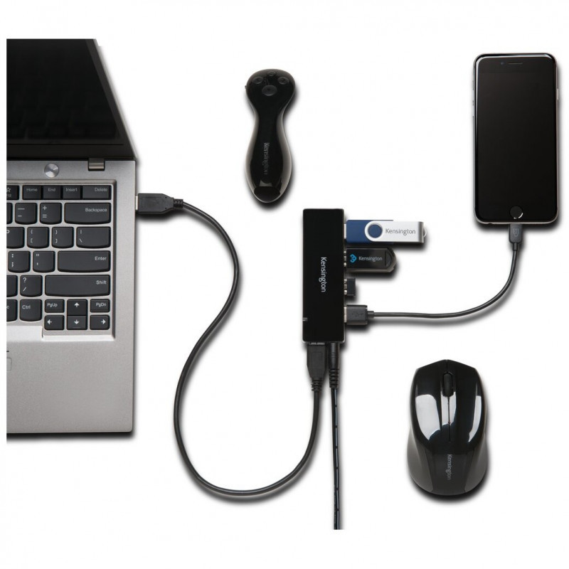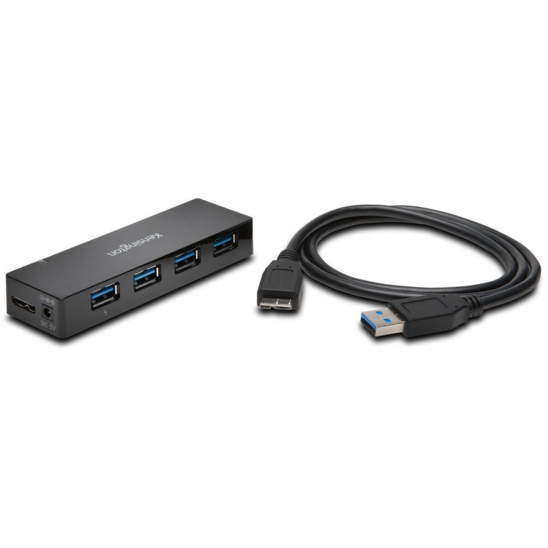 "Kensington USB 3.0 4-Port Hub + Charging. Host interface: USB 3.2 Gen 1 (3.1 Gen 1) Micro-B, Hub interfaces: USB 3.2 Gen 1 (3.1 Gen 1) Type-A. Data transfer rate: 5000 Mbit/s, Product colour: Black, Country of origin: China. Windows operating systems supported: Windows 7, Windows 7 Enterprise, Windows 7 Enterprise x64, Windows 7 Home Basic, Windows 7 Home..., Mac operating systems supported: Mac OS X 10.10 Yosemite, Mac OS X 10.11 El Capitan, Mac OS X 10.12 Sierra, Mac OS X 10.13 High..., Compatible operating systems: macOS 10.6 or above; Windows XP or above. Width: 75 mm, Depth: 51 mm, Height: 14.5 mm. Quantity per pack: 1 pc(s), Package width: 126 mm, Package depth: 136 mm"\n"75 mm x 51 mm x 14.5 mm