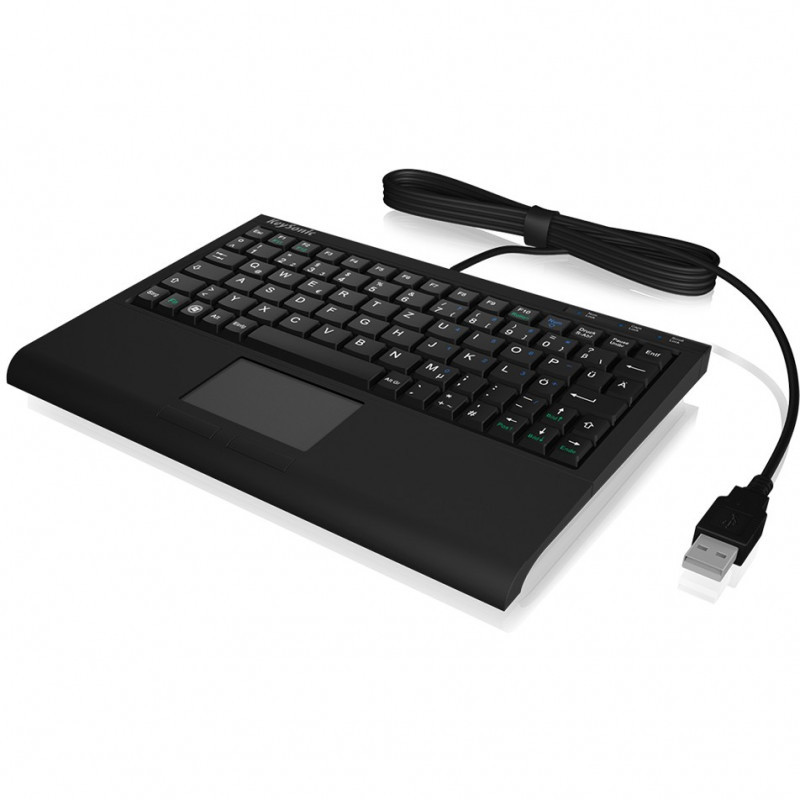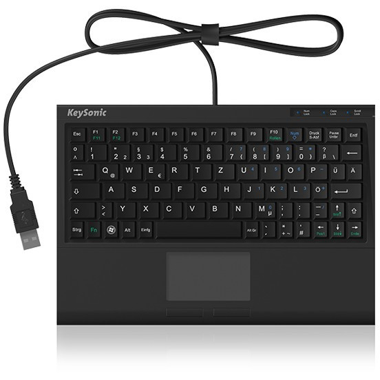 "KeySonic ACK-3410 (US). Keyboard form factor: Mini, Connectivity technology: Wired, Device interface: USB, Keyboard key switch: Membrane, Keyboard number of keys: 80. Cable length: 2 m. Recommended usage: Office. Product colour: Black"\n"Super compact keyboard with integrated Smart-Touchpad