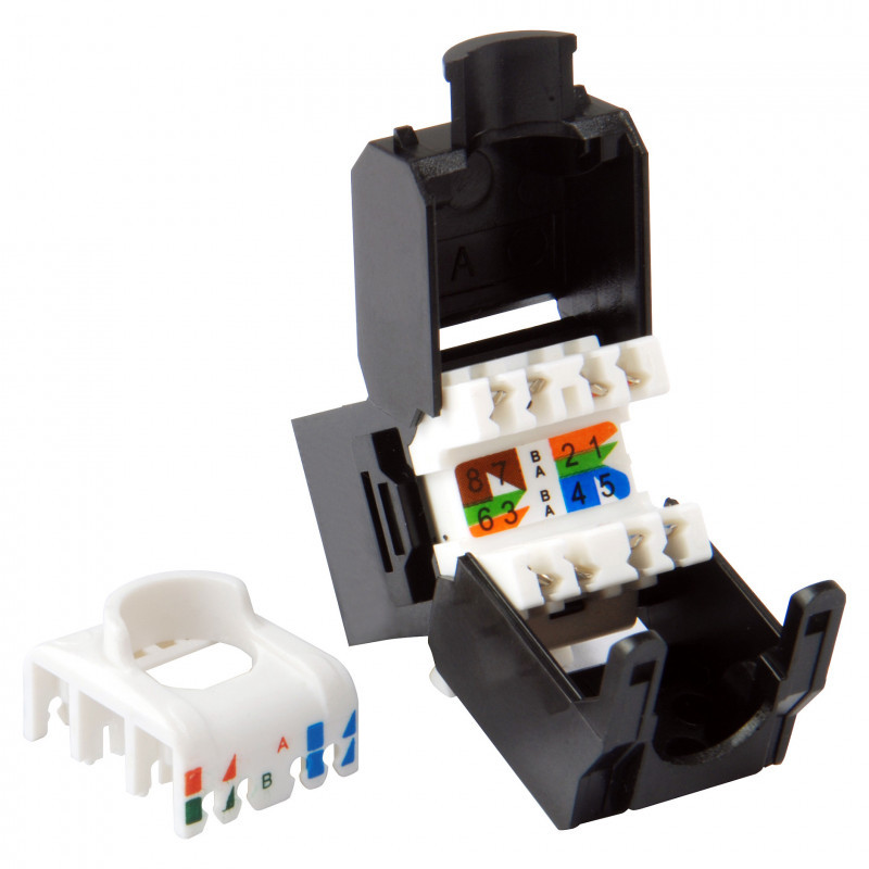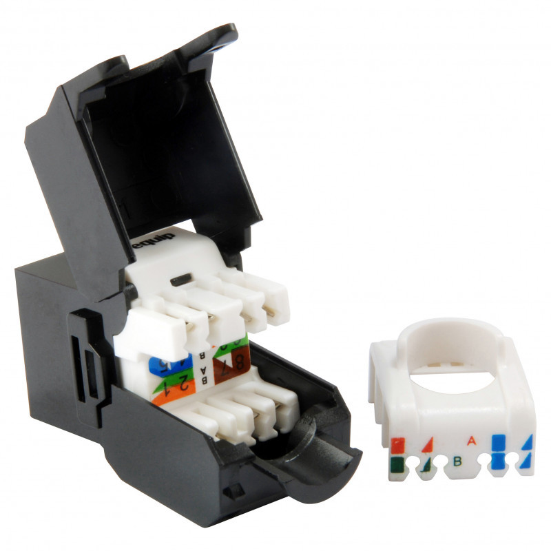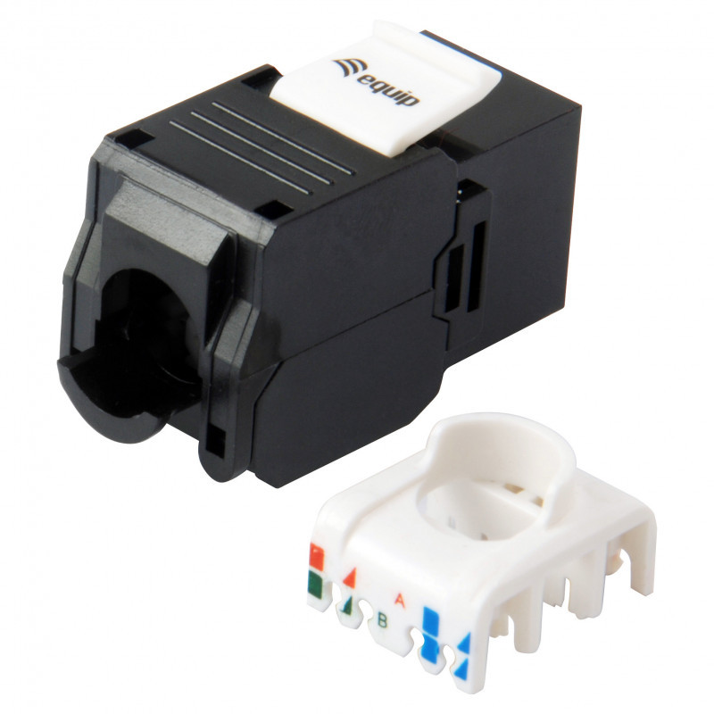 "Equip Cat.6A Unshielded Keystone Jack Toolfree. Connector 1: RJ-45, Connector 2: LSA, Connector contacts plating: Gold. Product colour: Black"\n"The equip® Keystone Jack is the essential component for a reliable cabling system. Composed of preeminent materials, the keystone jacks are thoroughly examined to meet or surpass the industrial standards. Fitting to the faceplates, wall-mount outlets, and patch panels, the keystone jacks offer a flexible connection for the Cat.6A cabling installation. "