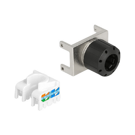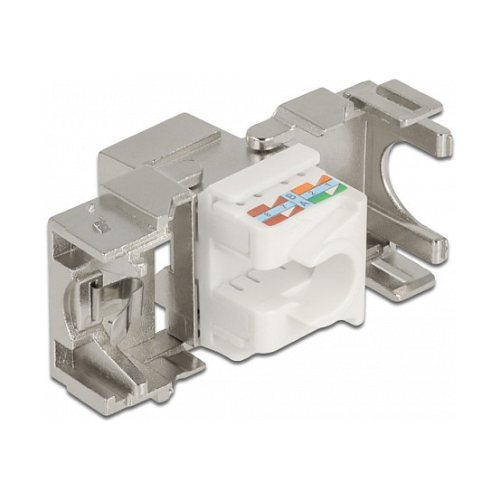 "DeLOCK Keystone Module RJ45 jack to LSA Cat.6A 180° toolfree metal. Construction type: Flat, Product colour: Stainless steel, Connector 1: RJ45. Width: 25 mm, Depth: 47.4 mm, Height: 16.9 mm. Quantity per pack: 2 pc(s)"\n"This module by Delock can be used to connect a network cable and is suitable for easy snap-in mounting in various holders, such as keystone patch panels, face plates or surface-mount boxes."