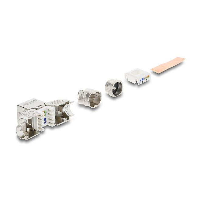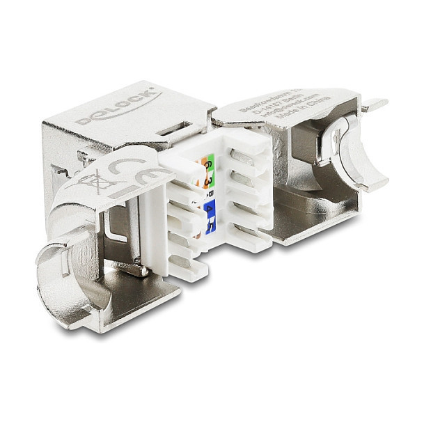 "DeLOCK Keystone Module RJ45 jack to LSA Cat.6A with metal latch tool-free 45° angled shielded. Construction type: Flat/Angled, Product colour: Silver, Connector 1: RJ-45. Width: 16.1 mm, Depth: 32.8 mm, Height: 19.4 mm. Package type: Polybag. Quantity per pack: 1 pc(s). Country of origin: China"\n"This module by Delock can be used to connect a network cable and is suitable for easy snap-in mounting in various holders, such as keystone patch panels, face plates or surface-mount boxes.