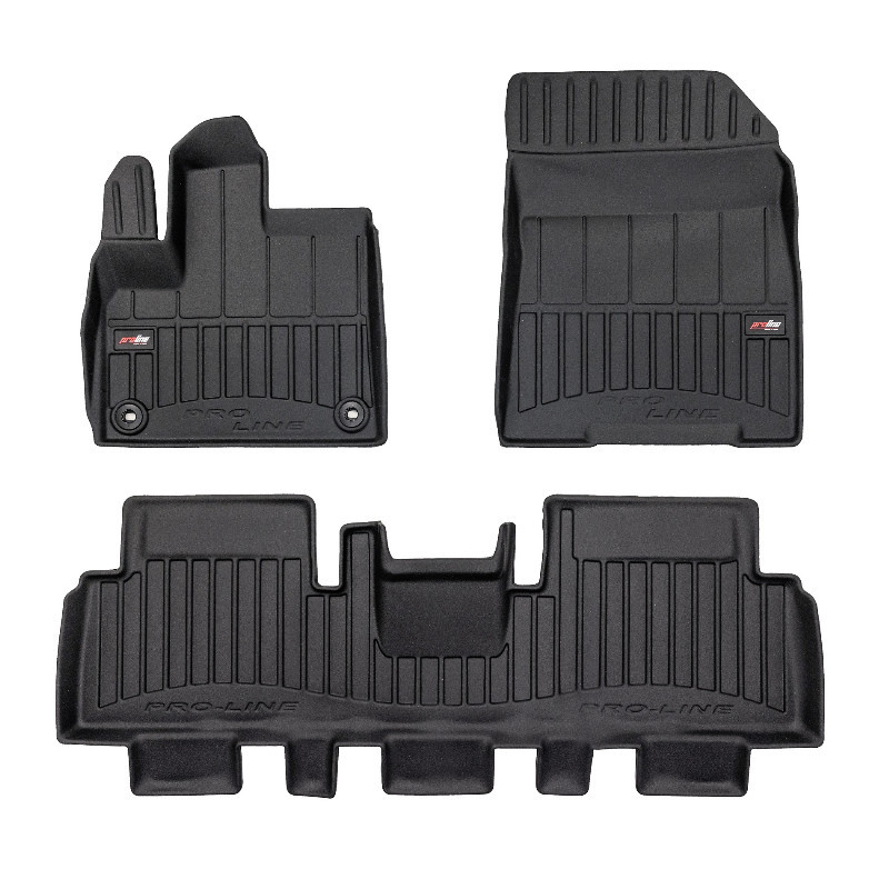 Guminiai ProLine 3D kilimėliai: (aukštos kokybės plastiko, gumos mišinys / TPE, komplektas - 4vnt., juodi, krašto aukštis 7 cm, montavimo būdas - spaustukai). AUTOMOBILIŲ KILIMĖLIAI FROGUM 3D PROLINE LUXURY • Dėl naujoviškos 3D skenavimo technologijos atitinka idealiai; • Kraštai papildomai apsaugoti – aukštis 7 cm, visada švarus automobilis; • Itin patvari medžiaga su unikalia neslystančia struktūra, atspari nešvarumams. • Išskirtinis stabilumas dėl spaustukų – lengvai montuojama spustelėjus; • Pakojo zonos apsauga – komfortas, leidžiantis nuleisti vairuotojo koją; 3D ProLine aukštos kokybės guminiai kilimėliai padeda išlaikyti automobilį švarų. Modernus ir funkcionalus dizainas, ir ypač aukštas kraštas garantuoja efektyvų vandens ir purvo surinkimą ir neleidžia jiems išbėgti. Taip automobilio salonas išlieka švarus. Pagaminti iš aukštos kokybės gumos, kurioje nėra toksiškų komponentų. Bekvapis. Kilimėliai idealiai atitinka ir puikiai priglunda prie salono grindų. Guminiai kilimėliai išlaiko savo elastingumą net esant temperatūros pokyčiams. Specialus paviršius neleidžia kilimėliams slysti vairuojant, o tai daro didelę įtaką saugumui ir kelionės patogumui.
