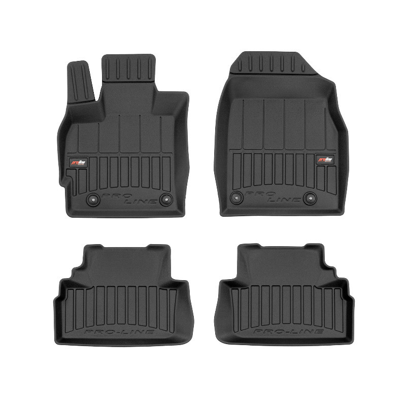 Guminiai ProLine 3D kilimėliai: (aukštos kokybės plastiko, gumos mišinys / TPE, komplektas - 4vnt., juodi, krašto aukštis 7 cm, montavimo būdas - spaustukai). AUTOMOBILIŲ KILIMĖLIAI FROGUM 3D PROLINE LUXURY • Dėl naujoviškos 3D skenavimo technologijos atitinka idealiai; • Kraštai papildomai apsaugoti – aukštis 7 cm, visada švarus automobilis; • Itin patvari medžiaga su unikalia neslystančia struktūra, atspari nešvarumams. • Išskirtinis stabilumas dėl spaustukų – lengvai montuojama spustelėjus; • Pakojo zonos apsauga – komfortas, leidžiantis nuleisti vairuotojo koją; 3D ProLine aukštos kokybės guminiai kilimėliai padeda išlaikyti automobilį švarų. Modernus ir funkcionalus dizainas, ir ypač aukštas kraštas garantuoja efektyvų vandens ir purvo surinkimą ir neleidžia jiems išbėgti. Taip automobilio salonas išlieka švarus. Pagaminti iš aukštos kokybės gumos, kurioje nėra toksiškų komponentų. Bekvapis. Kilimėliai idealiai atitinka ir puikiai priglunda prie salono grindų. Guminiai kilimėliai išlaiko savo elastingumą net esant temperatūros pokyčiams. Specialus paviršius neleidžia kilimėliams slysti vairuojant, o tai daro didelę įtaką saugumui ir kelionės patogumui