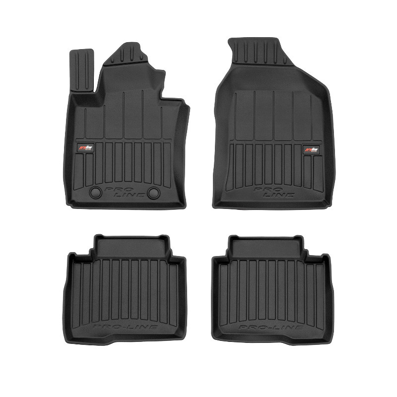 Guminiai ProLine 3D kilimėliai: (aukštos kokybės plastiko, gumos mišinys / TPE, komplektas - 3vnt., juodi, krašto aukštis 7 cm, montavimo būdas - spaustukai). AUTOMOBILIŲ KILIMĖLIAI FROGUM 3D PROLINE LUXURY • Dėl naujoviškos 3D skenavimo technologijos atitinka idealiai; • Kraštai papildomai apsaugoti – aukštis 7 cm, visada švarus automobilis; • Itin patvari medžiaga su unikalia neslystančia struktūra, atspari nešvarumams. • Išskirtinis stabilumas dėl spaustukų – lengvai montuojama spustelėjus; • Pakojo zonos apsauga – komfortas, leidžiantis nuleisti vairuotojo koją; 3D ProLine aukštos kokybės guminiai kilimėliai padeda išlaikyti automobilį švarų. Modernus ir funkcionalus dizainas, ir ypač aukštas kraštas garantuoja efektyvų vandens ir purvo surinkimą ir neleidžia jiems išbėgti. Taip automobilio salonas išlieka švarus. Pagaminti iš aukštos kokybės gumos, kurioje nėra toksiškų komponentų. Bekvapis. Kilimėliai idealiai atitinka ir puikiai priglunda prie salono grindų. Guminiai kilimėliai išlaiko savo elastingumą net esant temperatūros pokyčiams. Specialus paviršius neleidžia kilimėliams slysti vairuojant, o tai daro didelę įtaką saugumui ir kelionės patogumui