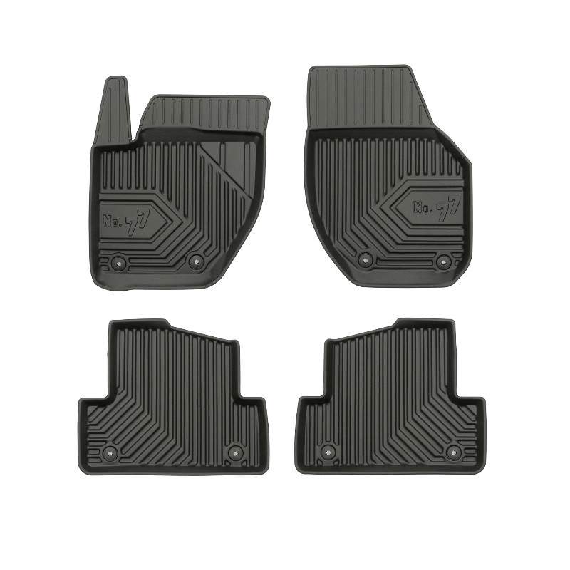 Guminiai Premium 77 kilimėliai: (aukštos kokybės plastiko, gumos mišinys / TPE, komplektas - 4vnt., juodi, krašto aukštis 4 cm, montavimo būdas - spaustukai). AUTOMOBILIŲ KILIMĖLIAI FROGUM 77 PREMIUM • Dėl naujoviškos 3D skenavimo technologijos atitinka idealiai; • Krašto aukštis - 4 cm suteikia didesnę apsaugą nuo nešvarumų • Modernus ir funkcionalus dizainas, išlaikantis nešvarumus kilimėlio viduje • Neslystantys spacialūs spaustukai, lengva montuoti; • Speciali apsauga, leidžianti nuleisti vairuotojo koją; Aukšto lygio apsauga jūsų automobiliui, kilimėliai idealiai atitinka ir puikiai priglunda prie salono grindų. Modernus ir funkcionalus dizainas, bei aukštas kraštas garantuoja efektyvų vandens ir purvo surinkimą ir neleidžia jam nutekėti. Taip automobilio salonas išlieka švarus. Pagaminti iš aukštos kokybės gumos, kurioje nėra toksiškų komponentų. Bekvapis. Kilimėliai turi spaustukus, todėl jį lengva pritvirtinti prie grindų. Guminiai kilimėliai išlaiko savo elastingumą net esant temperatūros pokyčiams. Specialus paviršius neleidžia kilimėliams slysti vairuojant, todėl labai paveikia saugumą ir kelionės komfortą.