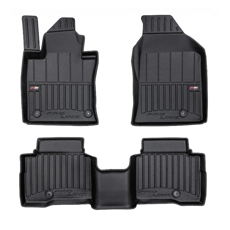Guminiai ProLine 3D kilimėliai: (aukštos kokybės plastiko, gumos mišinys / TPE, komplektas - 4vnt., juodi, krašto aukštis 7 cm, montavimo būdas - spaustukai). AUTOMOBILIŲ KILIMĖLIAI FROGUM 3D PROLINE LUXURY • Dėl naujoviškos 3D skenavimo technologijos atitinka idealiai; • Kraštai papildomai apsaugoti – aukštis 7 cm, visada švarus automobilis; • Itin patvari medžiaga su unikalia neslystančia struktūra, atspari nešvarumams. • Išskirtinis stabilumas dėl spaustukų – lengvai montuojama spustelėjus; • Pakojo zonos apsauga – komfortas, leidžiantis nuleisti vairuotojo koją; 3D ProLine aukštos kokybės guminiai kilimėliai padeda išlaikyti automobilį švarų. Modernus ir funkcionalus dizainas, ir ypač aukštas kraštas garantuoja efektyvų vandens ir purvo surinkimą ir neleidžia jiems išbėgti. Taip automobilio salonas išlieka švarus. Pagaminti iš aukštos kokybės gumos, kurioje nėra toksiškų komponentų. Bekvapis. Kilimėliai idealiai atitinka ir puikiai priglunda prie salono grindų. Guminiai kilimėliai išlaiko savo elastingumą net esant temperatūros pokyčiams. Specialus paviršius neleidžia kilimėliams slysti vairuojant, o tai daro didelę įtaką saugumui ir kelionės patogumui